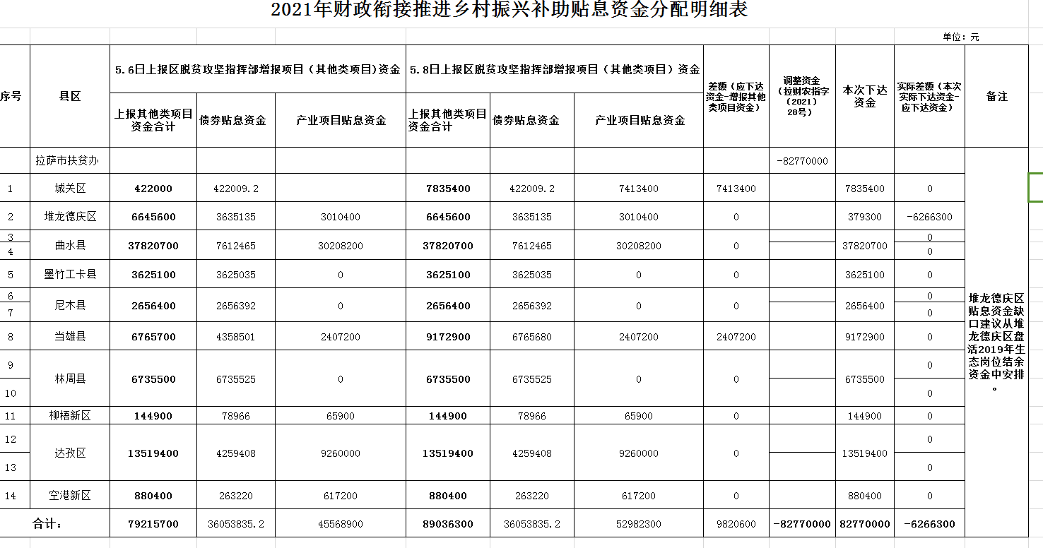 根据《西藏自治区财政厅关于下达2021年财政衔接推进乡村振兴补助资金预算的通知》(藏财农指〔2021〕14号)以及拉萨市脱贫攻坚指挥部的调整审批意见,现对《拉萨市财政局关于下达2021年财政衔接推进乡村振兴补助资金预算指标的通知》(拉财农指字〔2021〕28号)中下达至拉萨市乡村振兴局(原市扶贫办)贴息资金8277万元调整下达至各县区(详见附件)