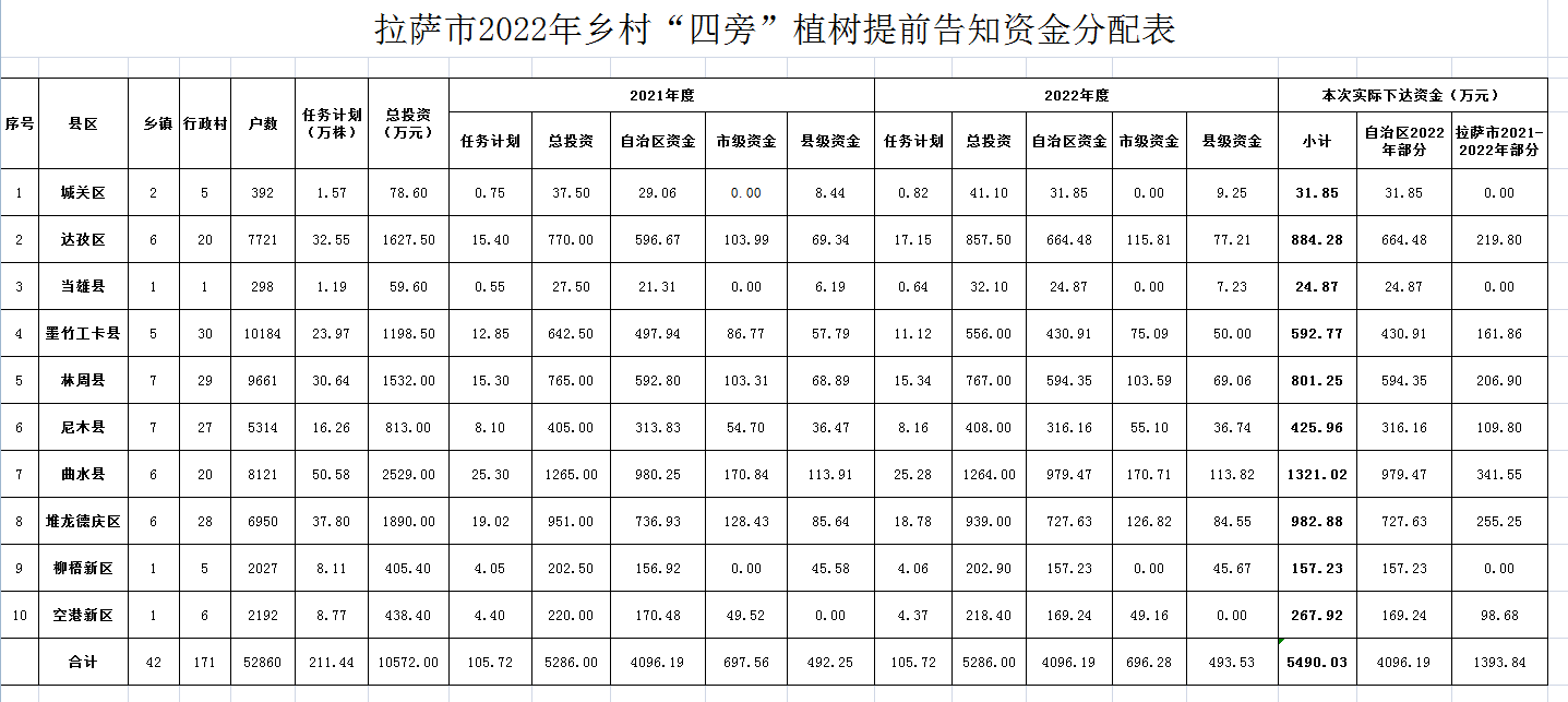 附件:拉萨市2022年乡村“四旁”植树提前告知资金分配表